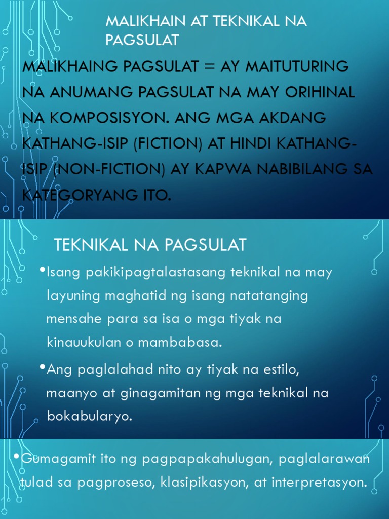 Malikhain paggamit ng mga isitilong pampanitikan at mga teknik na ginagamit ng mga manunlat ng piksyon 3. Ang malikhaing pagsulat creative writing ay anumang pagsusulat na lumalabas sa mga hangganan ng karaniwang prupesyunal pampamamahayag pang-akademiya o teknikal na mga anyo ng panitikan na pangkaraniwang nakikilala sa pamamagitan ng pagbibigay ng diin sa kagalingan o kasanayang pangpagsasalaysay pagpapaunlad ng tauhan at paggamit ng mga. Sa teknikal na pagsulat pormal ang wikang ginagamit at iniiwasan ang paggamit ng mga balbal bulgar at kolokyal.