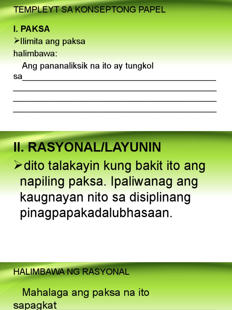 Mga Bahagi ng Konseptong Papel Limitadong Paksa Pamagat ARasyunal B. 91 - 100 of 500. Tentatibong Rebyu ng Kaugnay na Pag-aaral A.