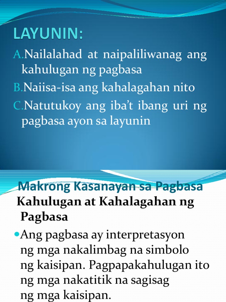 Makakatulong ito upang mahubog ang ating kaalaman at makakuha ng makabagong impormasyon. KAHULUGAN NG PAGSULAT Ito ay pagsasalin sa papel o sa anumang kasangkapangmaaaring magamit na mapagsasalinan ng mga nabuong salitasimbolo at ilustrasyon ng isang tao o mga tao sa layuning maipahayagang nasa kanyang kaisipan. Ang layunin ng pagbasa ay para tayoy makaunawa ng mga salita.