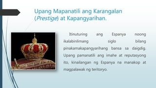 Ang Spain at Portuges ang pinakamalakas na kaharian sa bansa. Sagutin ang mga tanong sa iyong sagutang papel. KOLONYALISMO Patakaran ng isang bansa na may kinalaman sa pagpapalawak ng mga lupain sa.
