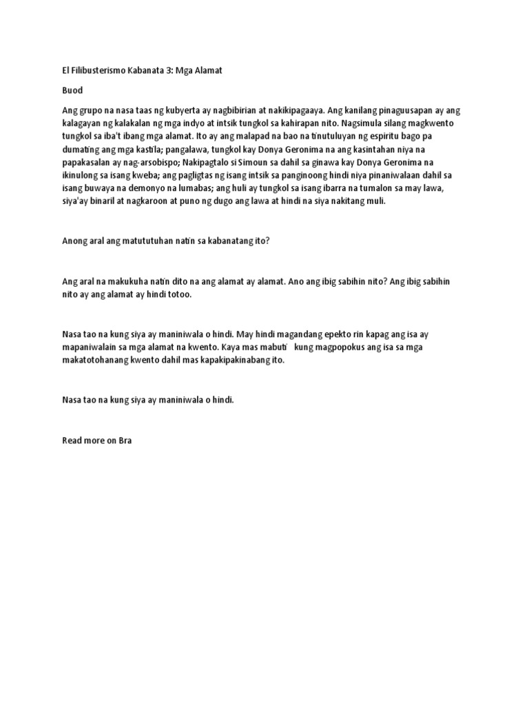 Ang mga Pilipino ay mayaman sa mga kwentong alamat. Ilang sandali pa ay dumating na rin ang binata. KABANATA III NG EL FILIBUSTERISMO Dahil hindi pangiging maginoo ang pagbibigay ng tahanang bato sa isang binigo ang pag-asa.