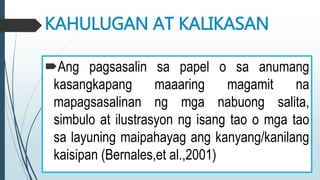 Kahulugan at Kalikasan Pagsulat Ito ay isang pisikal at mental na aktibiti na ginagawa para sa ibat ibang layunin. Ang layunin ng pagsulat ay maglahad. Maituring pisikal ang pagsulat dahil.