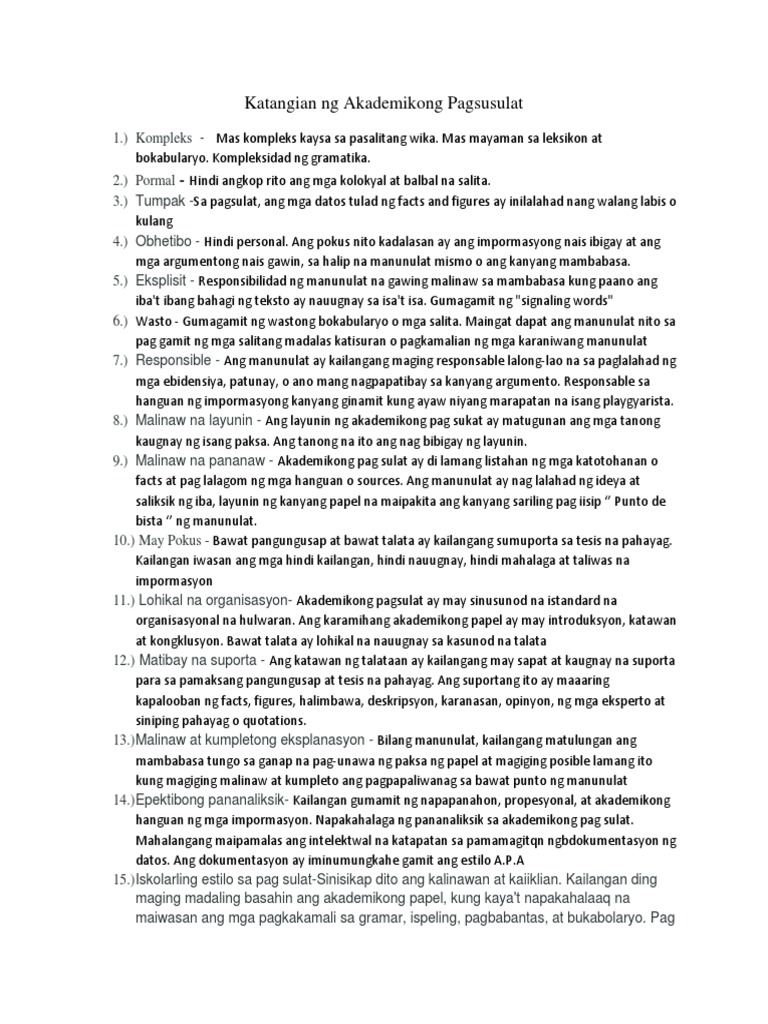 Ano Ang Mga Katangian Ng Akademikong Pagsusulat. Ito ay kadalasang bahagi ng isang tesis o disertasyon na makikita sa unahan ng pananaliksik pagkatapos ng title page o pahina ng pamagat. Bakit mahalaga ang paggamit ng akademikong filipino sa pagsulat.